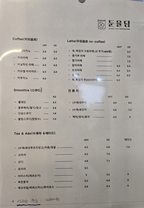 둔율담은 음료의 경우 1인 음료(디저트 포함 X)이다.