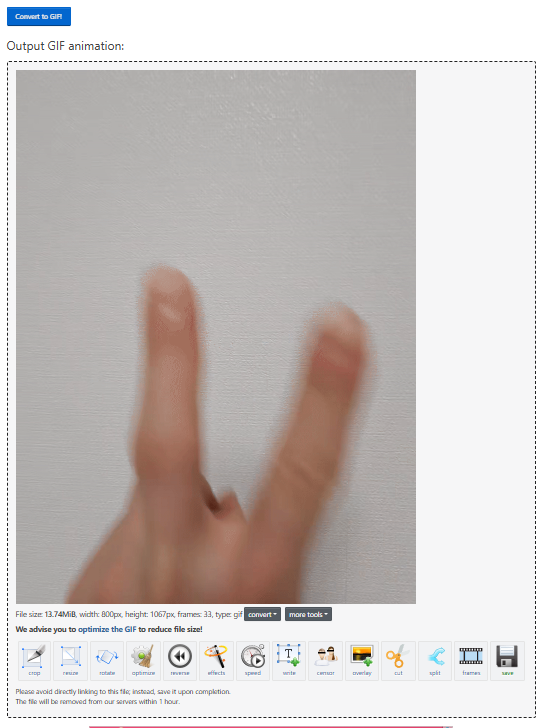 몇 초의 시간을 기다리면 Convert to GIF 버튼 아래에 움짤이 생성된다.