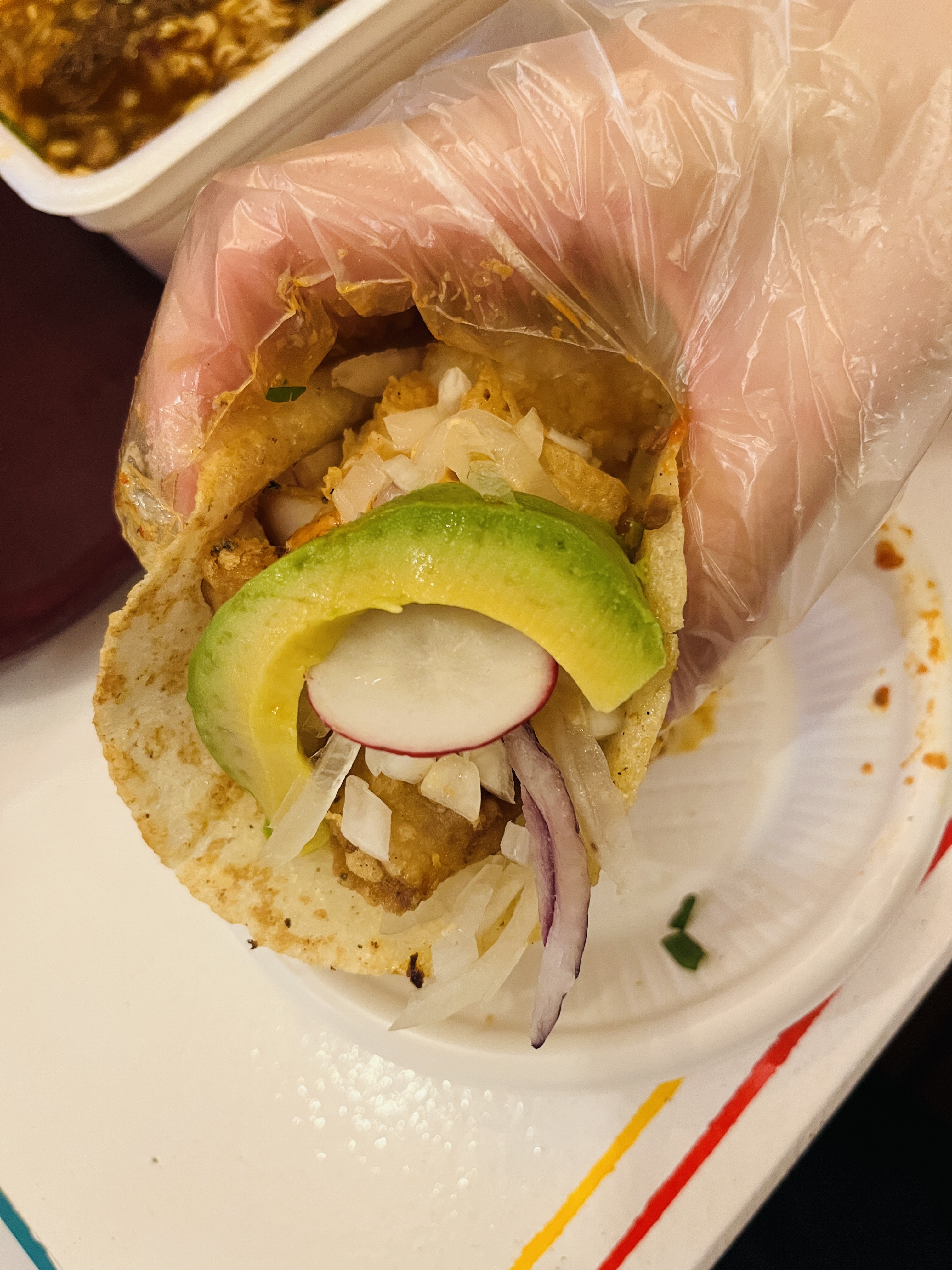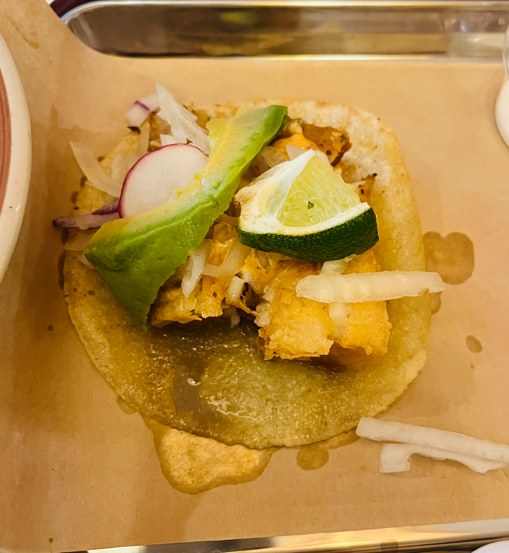 리뷰가 좋길래 맛보고 싶어서 시켜본 타코. 한 손에 안 잡힐 정도로 엄청 통통한 생선이 2조각이나 들어가 있었다.