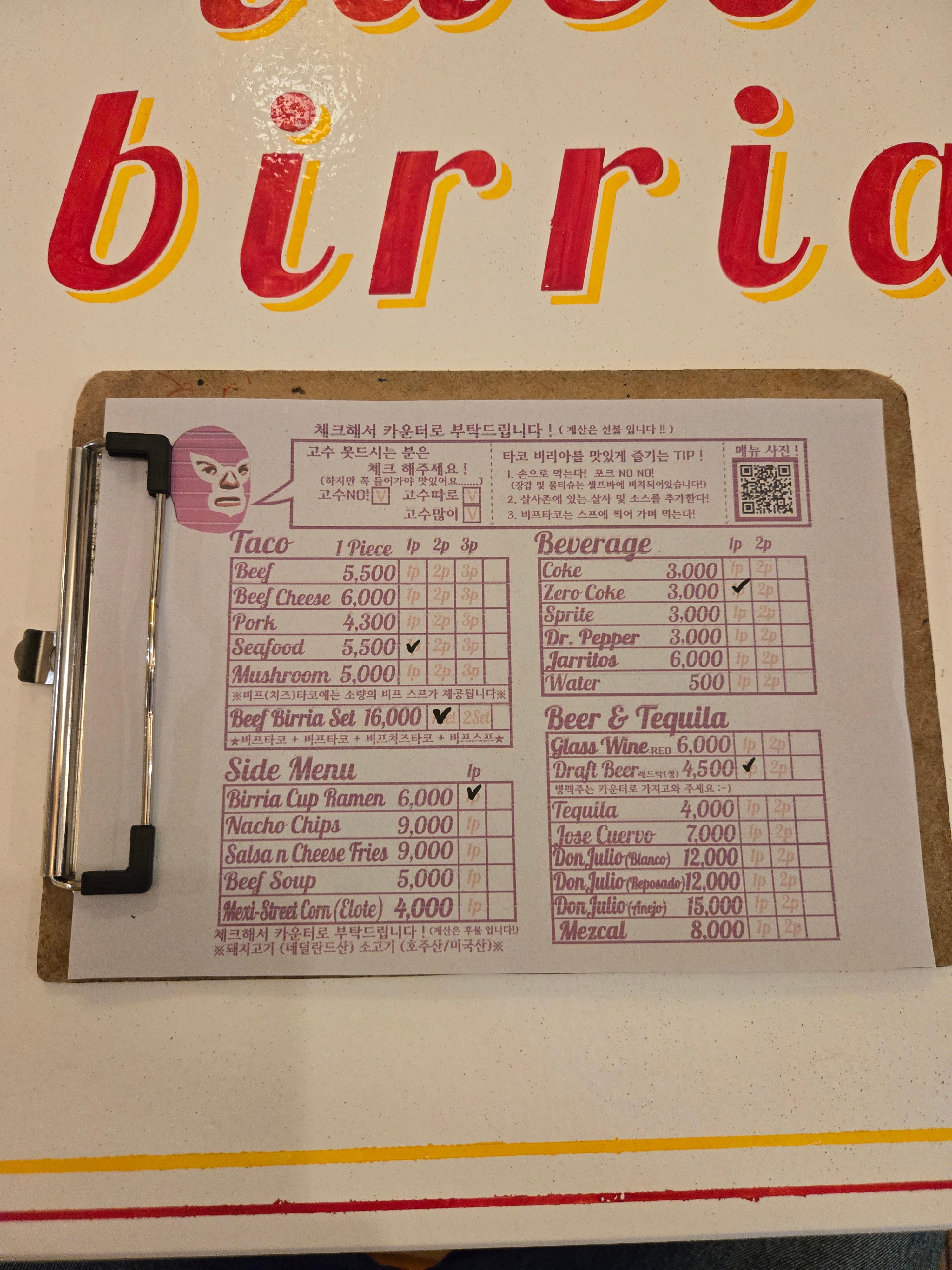 우리는 대표적인 Beef Birria Set와 Seafood 타코 1pc, Birria Cup Ramen, 레드락 생맥주, 제로콜라를 주문했다.