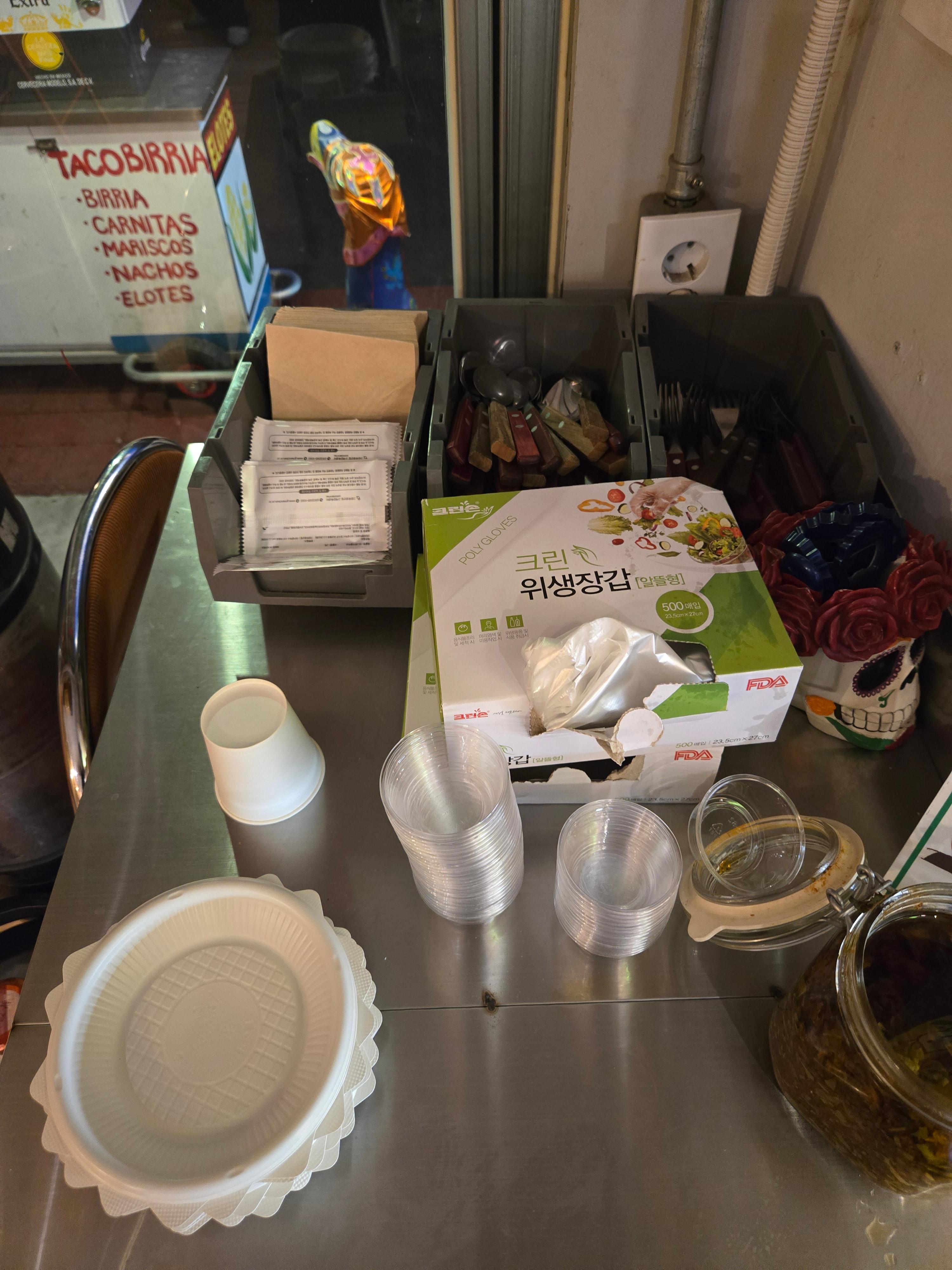 입구 쪽에 셀프바에는 피클, 살사소스, 위생장갑, 앞접시, 포크, 숟가락, 물티슈, 냅킨 등이 있다.