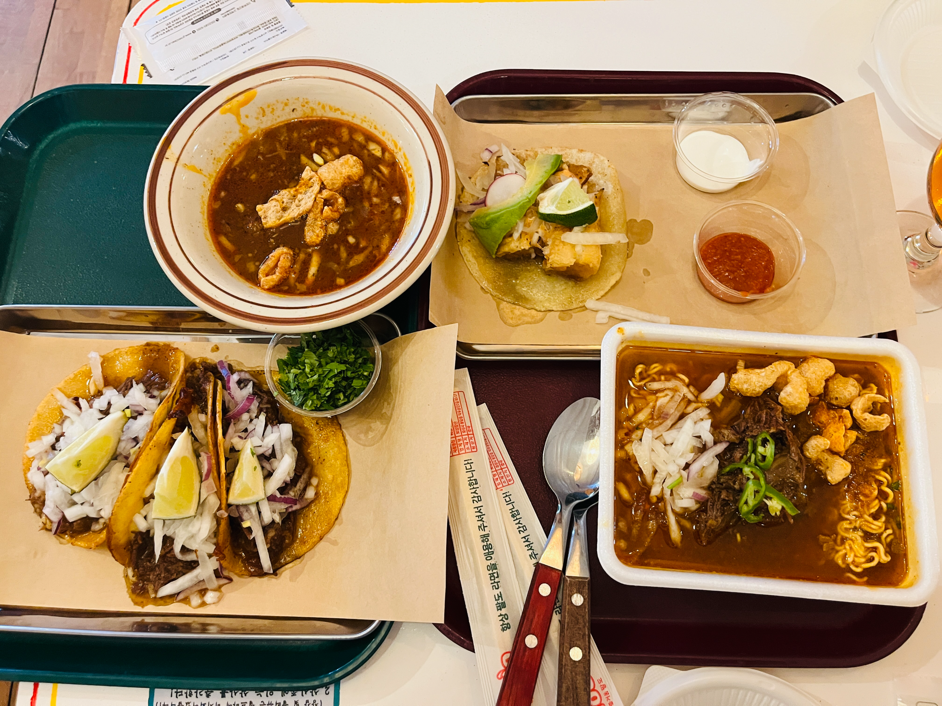 왼쪽이 타코세트가 담긴 트레이, 오른쪽이 별도로 주문한 씨푸드타코와 라면!