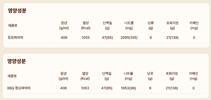 * 통모짜와퍼, BBQ 통모짜와퍼 칼로리 및 영양성분